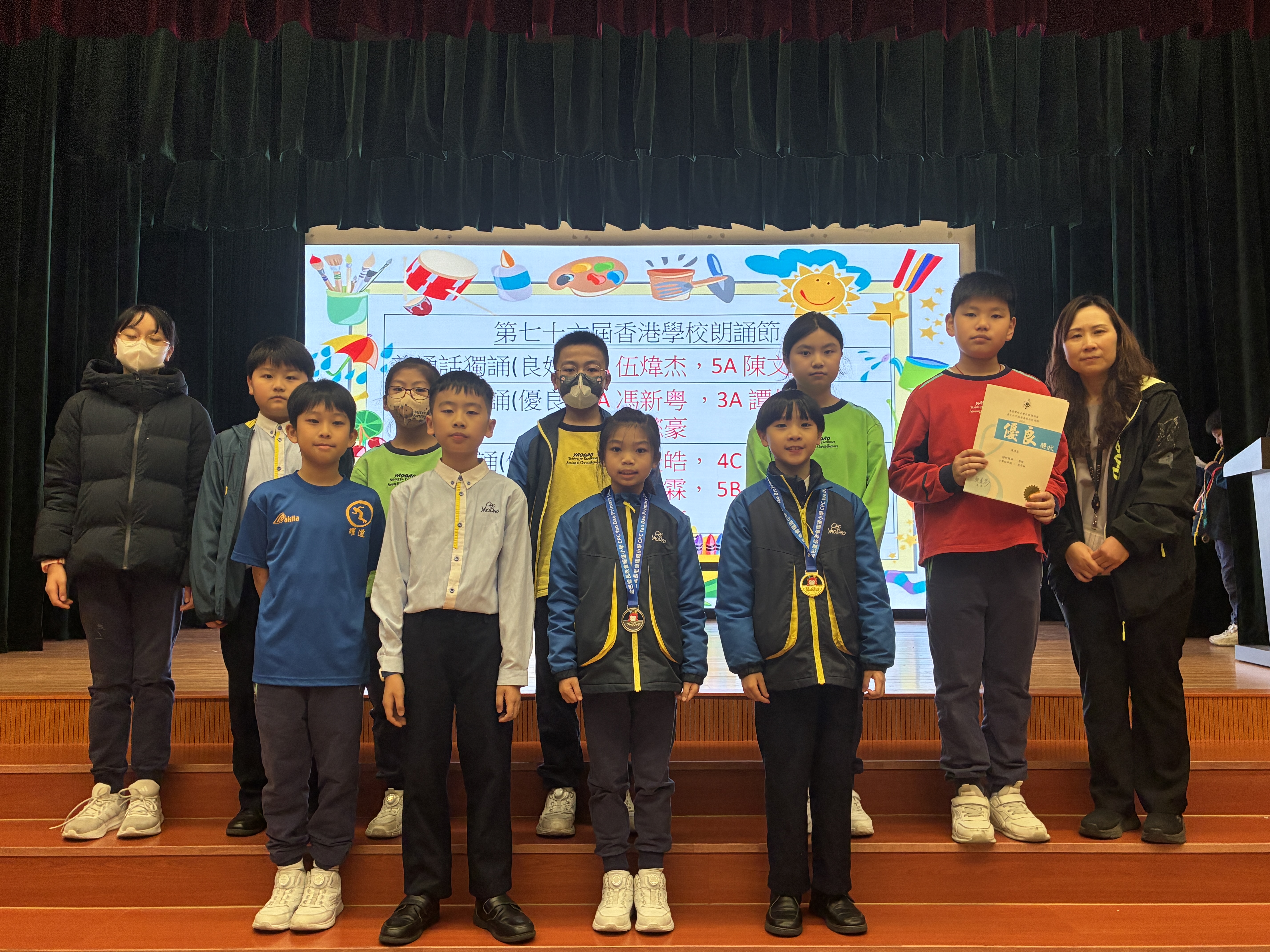 | 粵語獨誦 (優良) | 4A 馬浚皓,4C 劉彥妤,5B 陳靖霖,5B 郭沛賢,6C 鄧浠汶 |