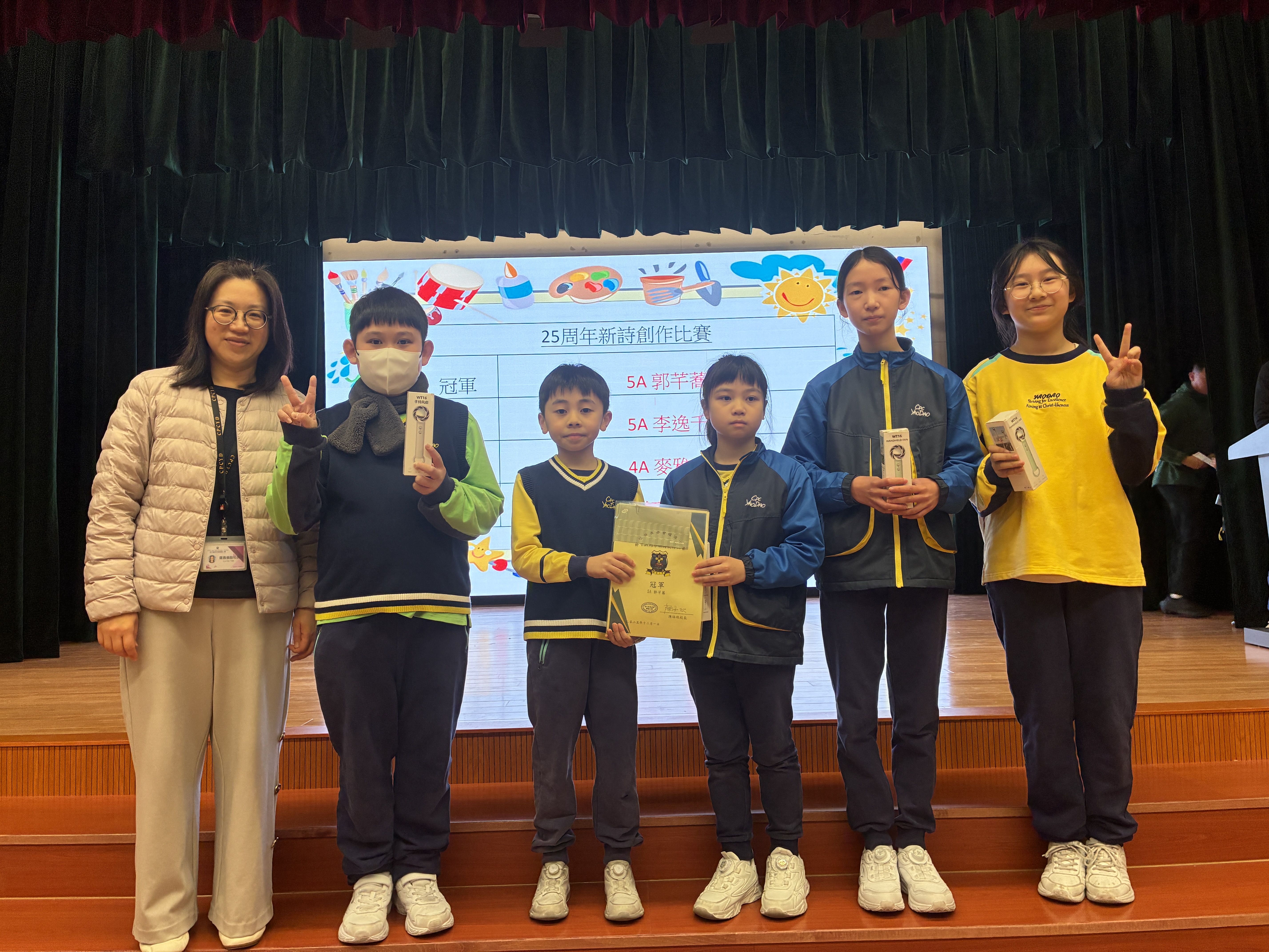 3A 李允姿,3C 陳子喬,3A 黃敏澄,3A 葉晉彰,4B 嚴皓, 4A 鍾坤儀,4C 劉睿諾,5A 黃嘉俐,5A 嚴沁悅,5B 林子熙 |