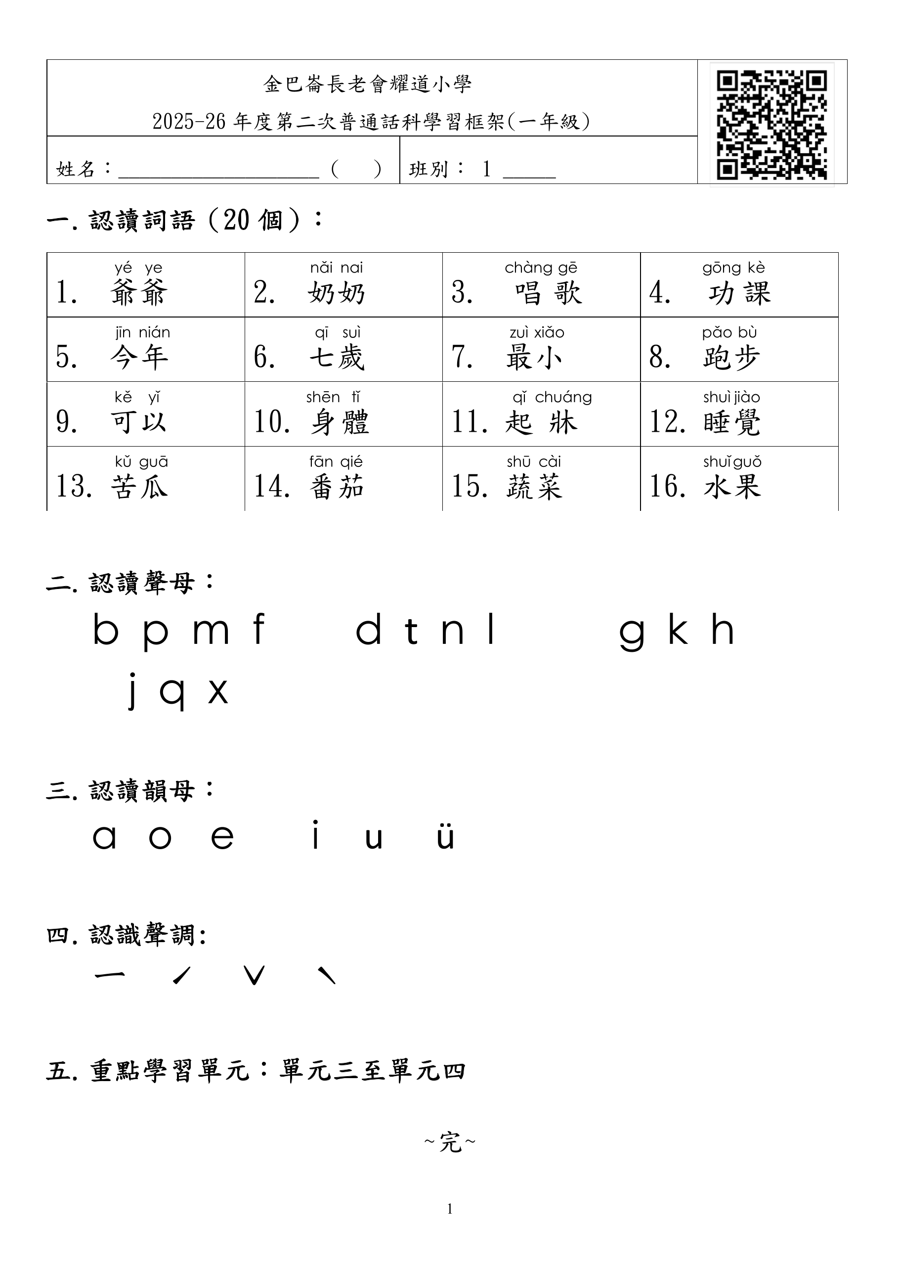 2025-2026 下學期小一普通話學習框架錄音